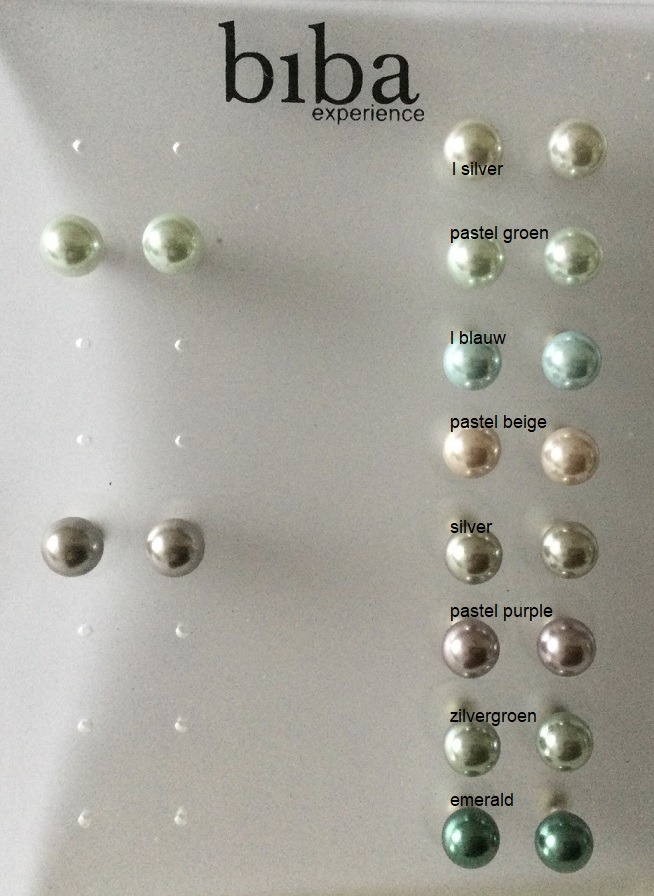 Deze oorstekers van biba zijn er in diverse zachte pasteltinten.  Doorsnede parel ongeveer 7 mm