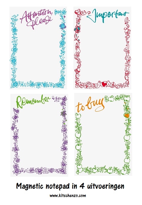Dankzij het grote magnetische vel aan de achterzijde, kan dit notitieblok op ieder metalen oppervlak bevestigd worden. Er zitten 60 vellen op ieder notitieblok. Er zijn 4 uitvoeringen: please..., attention...,remember...., to buy