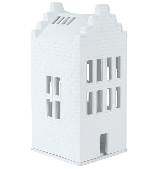 Prachtig lichthuis van ongeglazuurd porselein. Het lichthuis heeft de oer hollandse trapgevel. De muren zijn fraai afgewerkt met een stenen reliëf. Leuk om te combineren met andere Räder lichthuisjes.